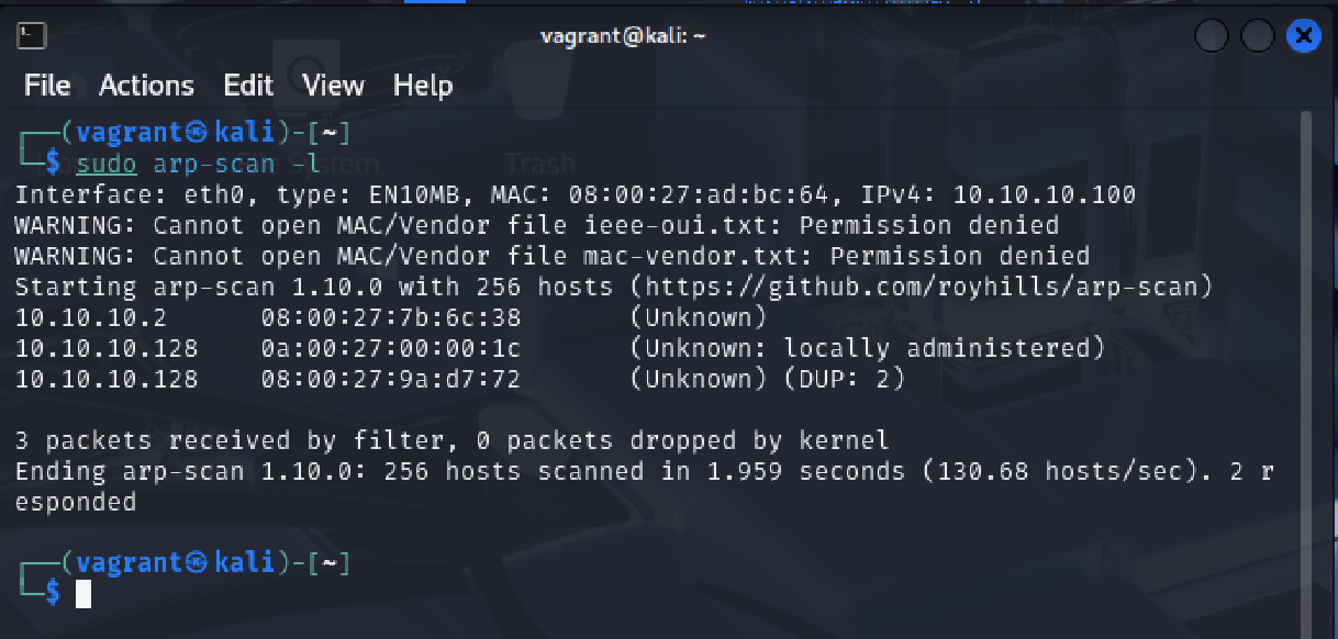 Lâoutil arp-scan permet dâidentifier les hĂŽtes actifs sur un rĂ©seau local en envoyant des requĂȘtes ARP. Cette analyse fournit, pour chaque machine dĂ©tectĂ©e, son adresse IP ainsi que son adresse MAC. Selon la documentation officielle, cet outil est particuliĂšrement utile pour dĂ©tecter des hĂŽtes qui pourraient ne pas rĂ©pondre aux sondes ICMP ou TCP classiques.