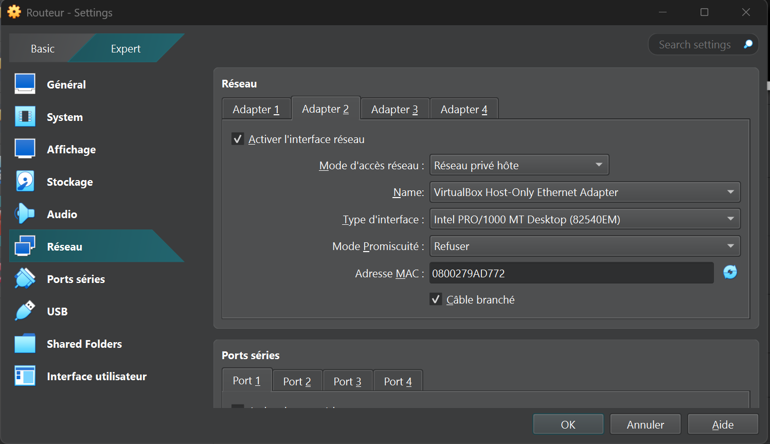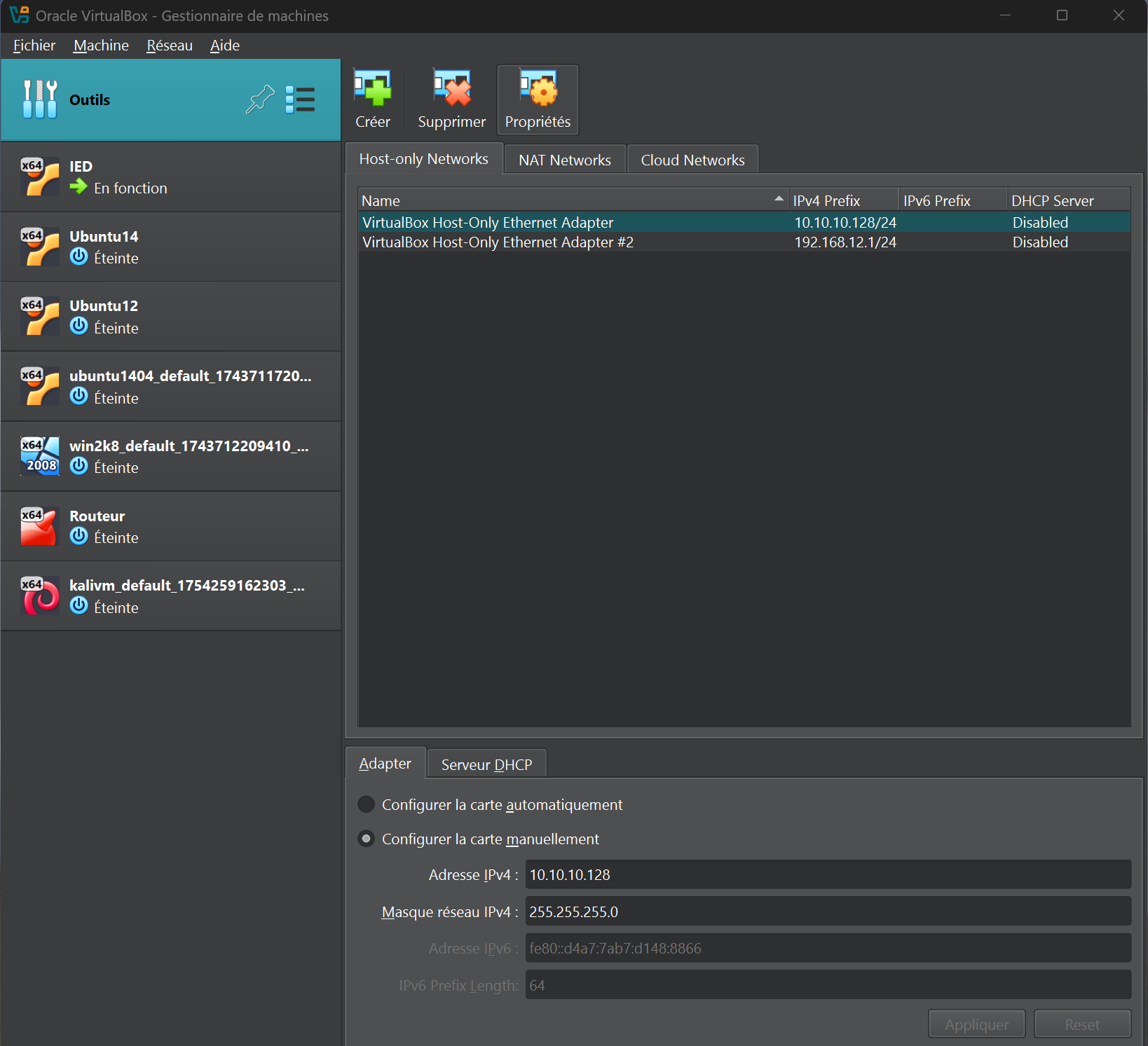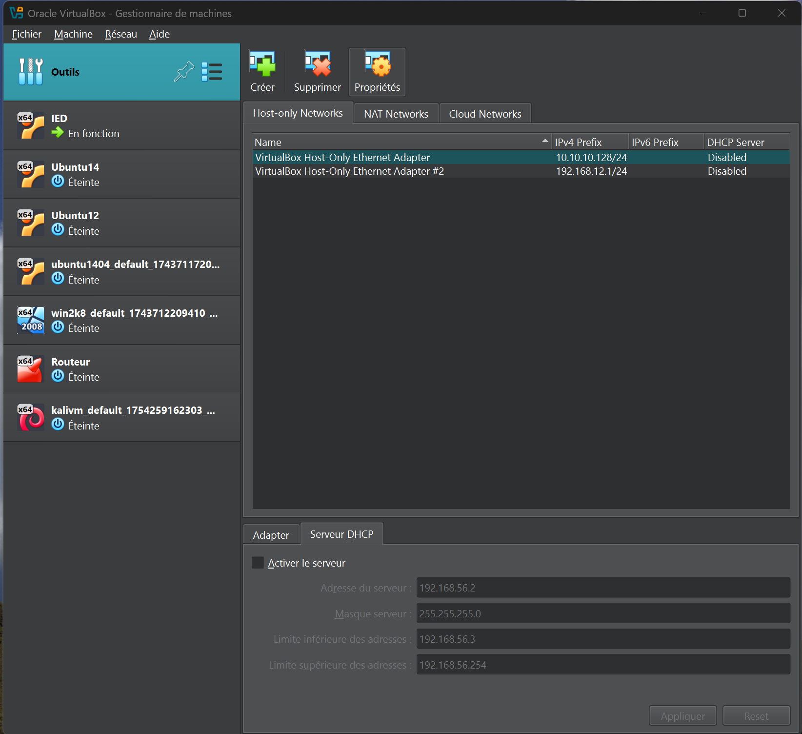 Dans VirtualBox, lâoutil Network Manager (menu Fichier > Gestionnaire de rĂ©seau) permet de visualiser les rĂ©seaux Host-only. On constate ici deux rĂ©seaux dĂ©finis :
