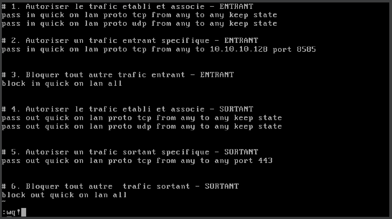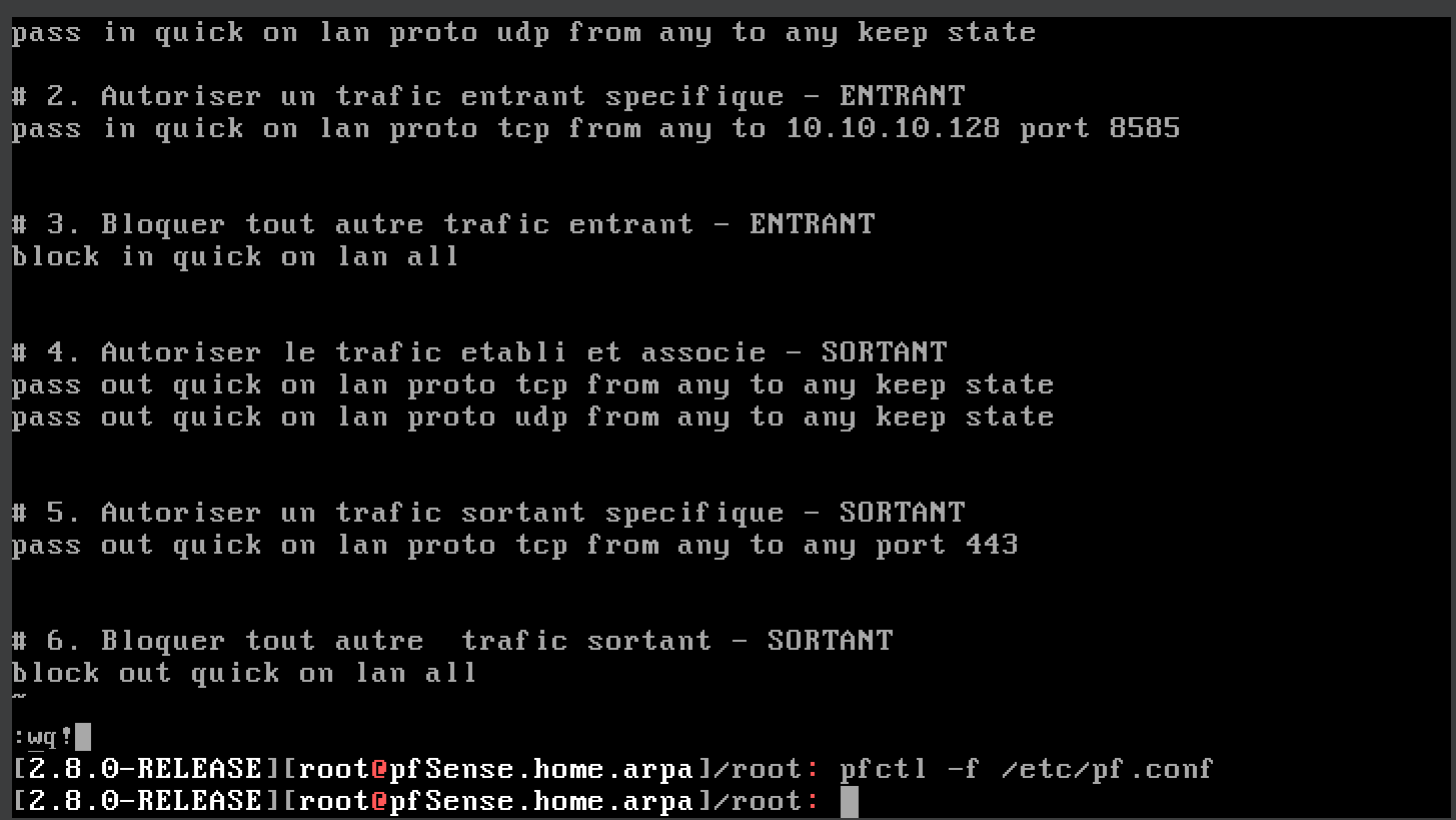 Les rĂšgles dĂ©finies dans /etc/pf.conf ne sont pas celles utilisĂ©es par pfSense En effet, avec pfSense, les rĂšgles configurĂ©es via lâinterface web ne sont pas stockĂ©es dans /etc/pf.conf. Elles sont en rĂ©alitĂ© gĂ©nĂ©rĂ©es dynamiquement Ă partir du fichier /conf/config.xml, et chargĂ©es automatiquement via les outils internes de pfSense. Cela signifie que: