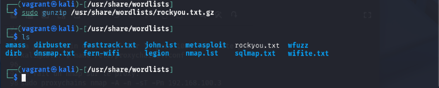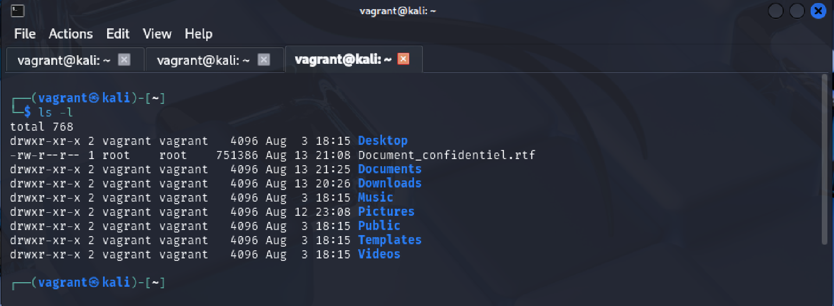 Le pirate sâassure que le tĂ©lĂ©chargement est bien effectif en consultant Ă lâaide de la commande ls, le dossier vagrant prĂ©sent rĂ©pertoire utilisateur.