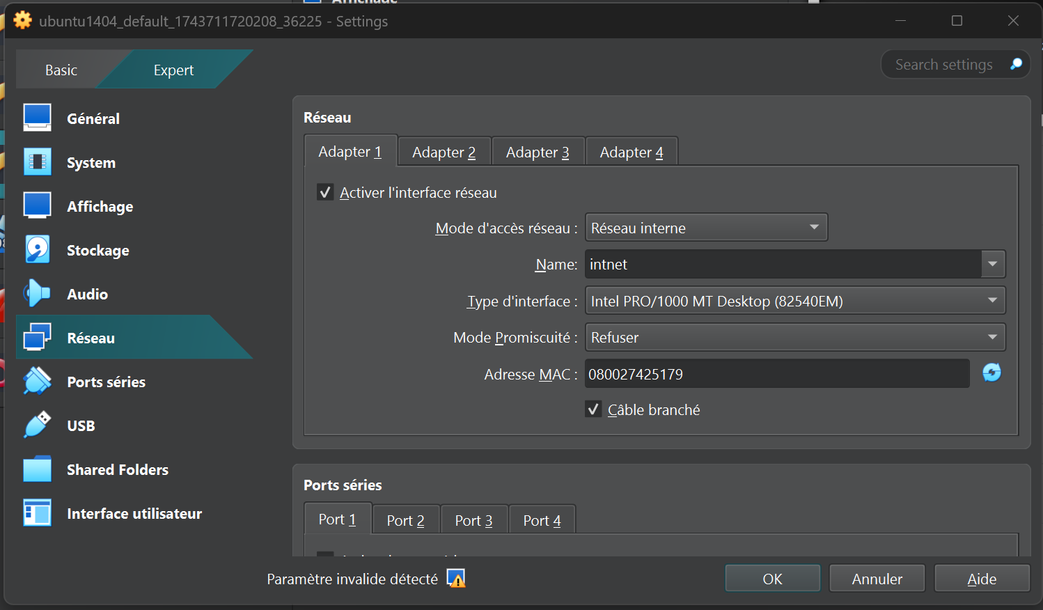 La machine Ubuntu 14.04 est connectée uniquement au réseau interne, intnet (Adaptateur 1 : Réseau interne), pour échanger exclusivement avec Windows Server 2008.