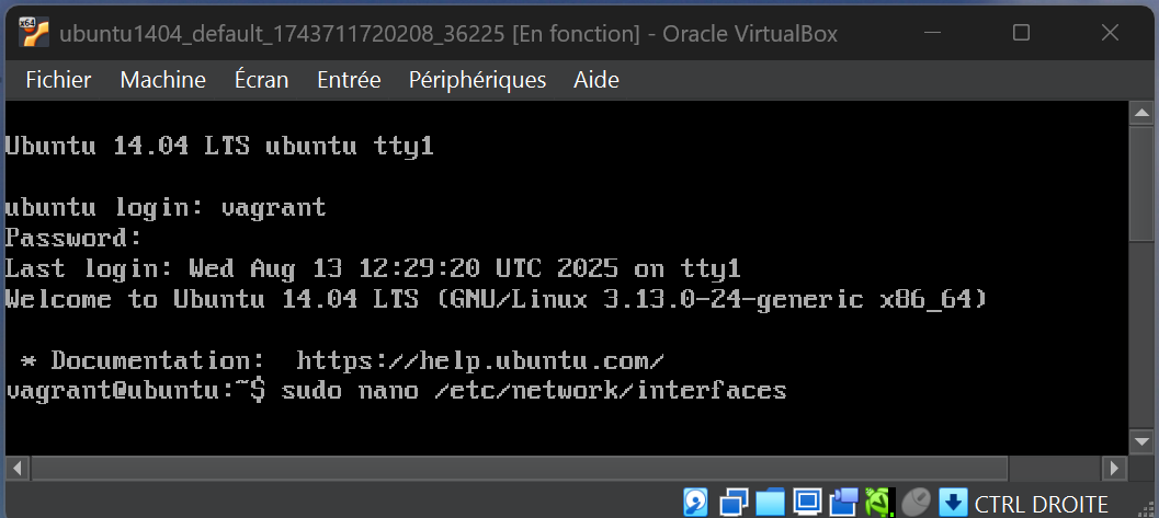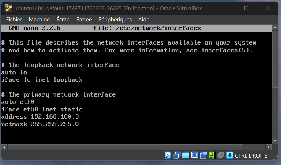 La configuration rĂ©seau de la machine Ubuntu 14.04 a Ă©tĂ© effectuĂ©e uniquement pour lâadaptateur rĂ©seau interne (intnet), destinĂ© Ă communiquer avec Windows Server 2008 via lâadresse IP 192.168.100.3/24.
