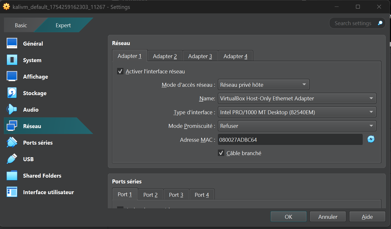La machine attaquante Kali Linux est reliée exclusivement au Réseau privé hÎte (Adaptateur 1: VirtualBox Host-Only Ethernet Adapter), pour communiquer avec Windows Server 2008 et pfSense (IP dans le sous-réseau 10.10.10.0/24).