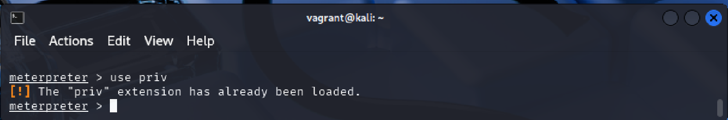 Une fois connectĂ©, il charge lâextension priv afin dâactiver les privilĂšges administrateur dans Meterpreter, ce qui lui permet dâextraire les hachages des noms dâutilisateur et mots de passe du systĂšme.