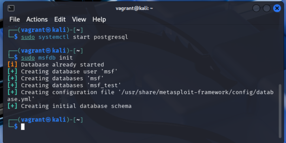 âŹ ïž Revenir au menu du rapportLors du premier lancement de Metasploit, il est recommandĂ© dâassocier une base de donnĂ©es afin de pouvoir stocker les rĂ©sultats des analyses rĂ©seau et les rĂ©utiliser directement dans le framework. Pour cela, il faut dĂ©marrer le service PostgreSQL, puis initialiser la base avec les commandes suivantes: