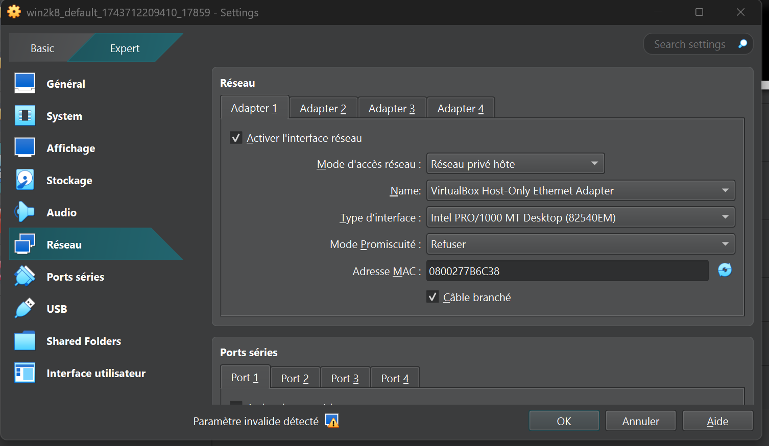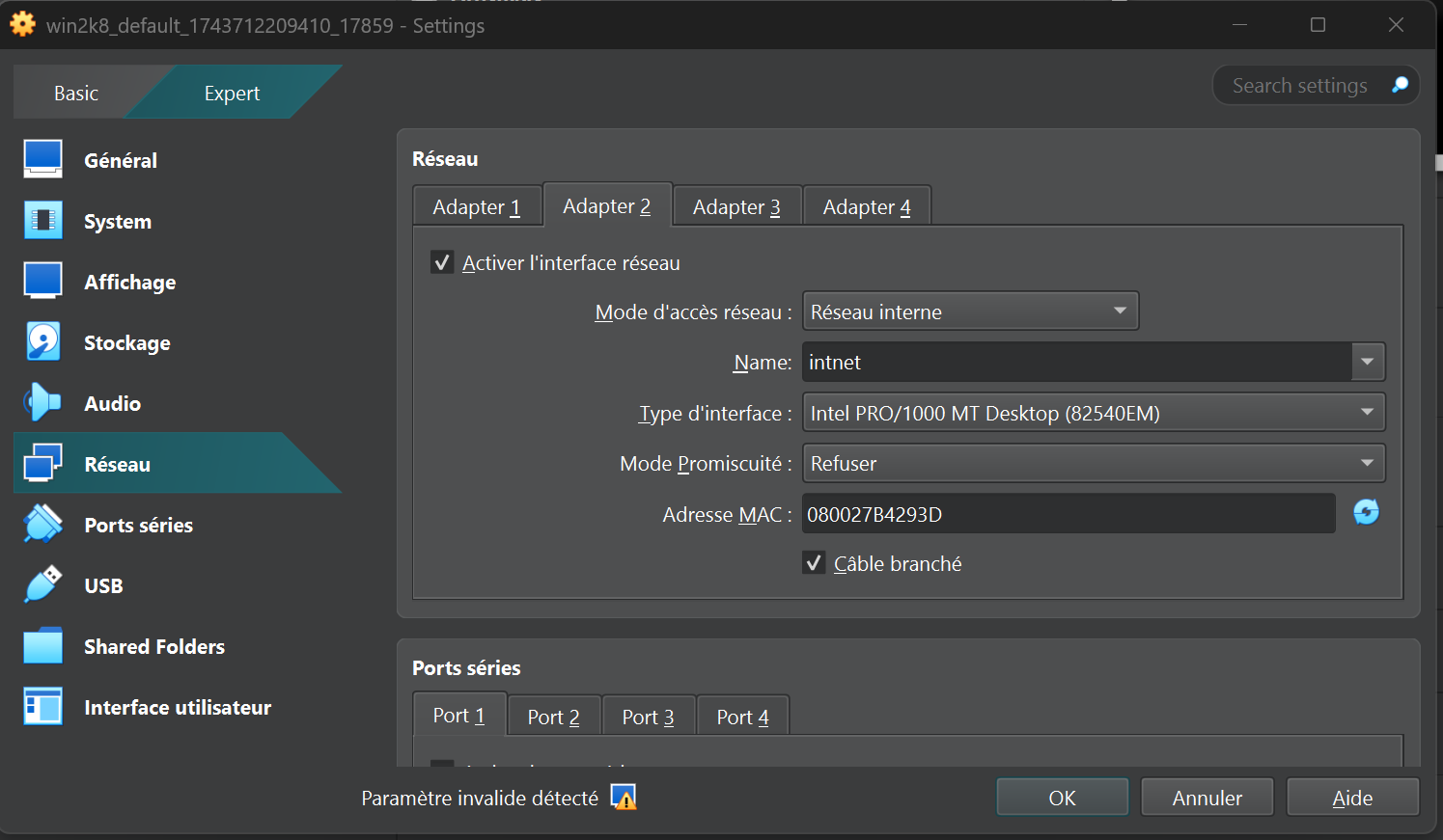 La machine pivot Windows Server 2008 est présente à la fois sur le réseau interne intnet (Adaptateur 2), dédié à la communication avec la machine Ubuntu 14.04, et sur le réseau relié à Internet Réseau privé hÎte (Adaptateur 1 :VirtualBox Host-Only Ethernet Adapter) , utilisé pour la communication avec Kali Linux et pfSense (IP dans le sous-réseau 10.10.10.0/24).