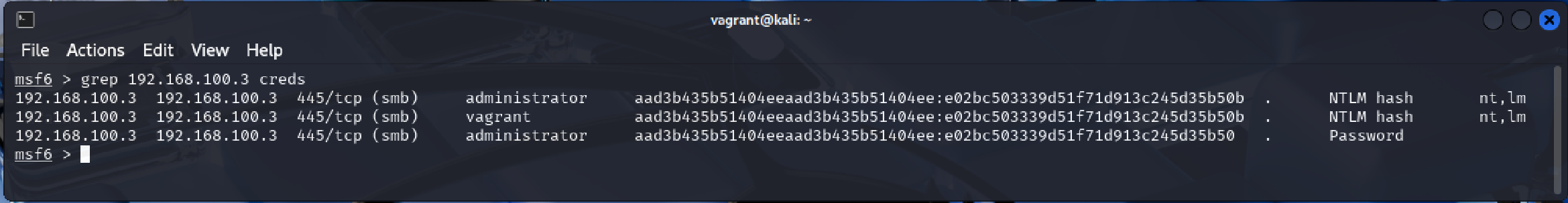 En examinant la sortie de la commande creds, le pirate remarque que trois entrées correspondent à la machine cachée (192.168.100.3). Il va donc utiliser la commande grep pour filtrer et afficher uniquement les informations relatives à ces entrées.