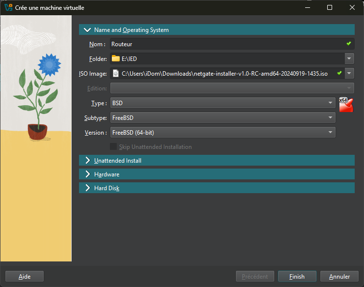 AprĂšs extraction des fichiers tĂ©lĂ©chargĂ©s, nous crĂ©ons une nouvelle machine virtuelle dans VirtualBox. Nous sĂ©lectionnons le type BSD, sous-type FreeBSD (64-bit), et attachons lâimage ISO comme disque dâamorçage.