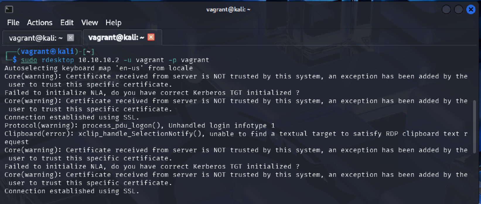 $ sudo rdesktop 10.10.10.2 -u vagrant -p vagrant