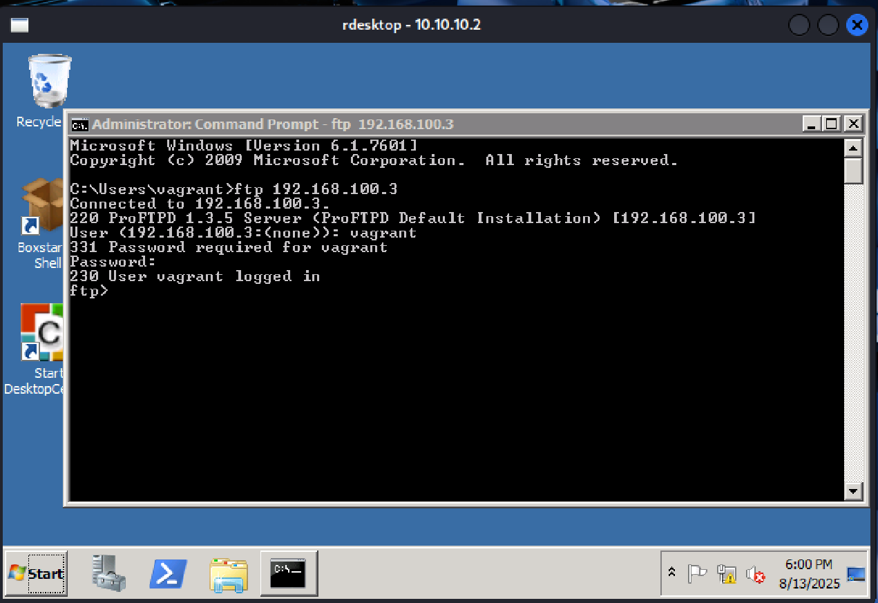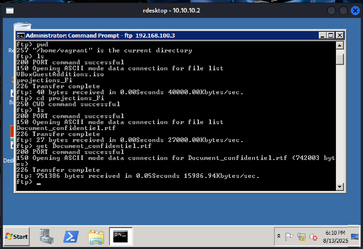 Le pirate constate que lâutilisateur vagrant est prĂ©sent Ă la fois sur la machine Windows 2008 (10.10.10.2) et sur la machine cachĂ©e (192.168.100.3). Ce compte sera donc utilisĂ© pour tenter une connexion au serveur FTP.