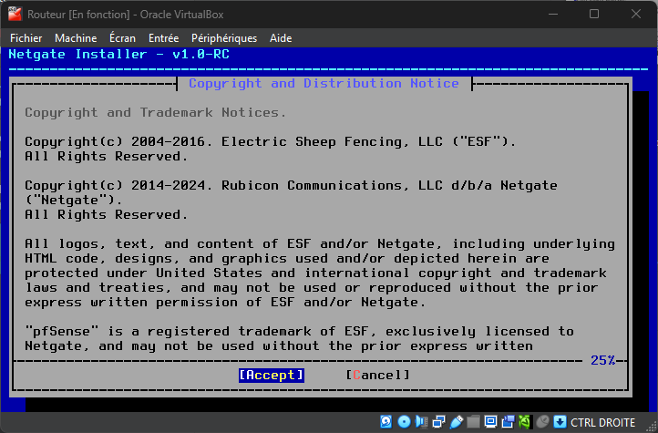 Lors du premier dĂ©marrage, lâinstallateur Netgate se lance. Nous acceptons les conditions de licence.