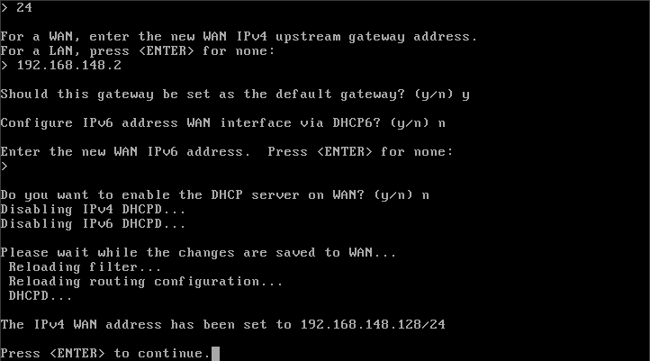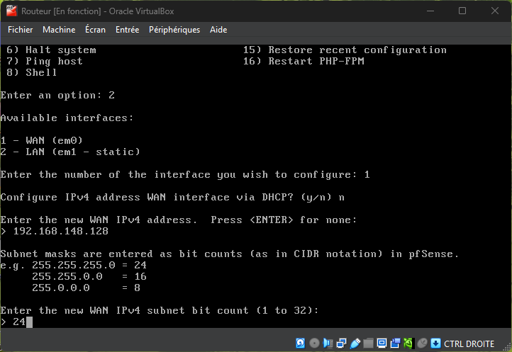 Nous accĂ©dons au menu console et choisissons lâoption 2: Set interface(s) IP address, puis sĂ©lectionnons WAN (em0). Nous dĂ©sactivons le DHCP (n) et configurons lâadresse IPv4 statique 192.168.148.128/24 avec comme passerelle 192.168.148.2, dĂ©finie comme passerelle par dĂ©faut (y).