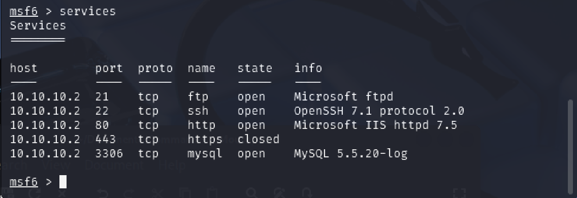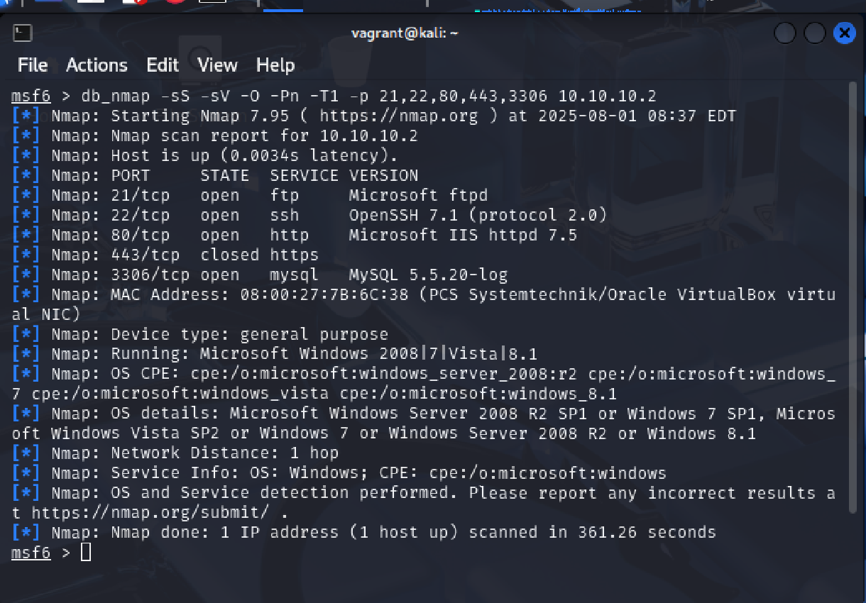 msf6 > db_nmap -sS -sV -O -Pn -T1 -p 21,22,80,443,3306 10.10.10.2