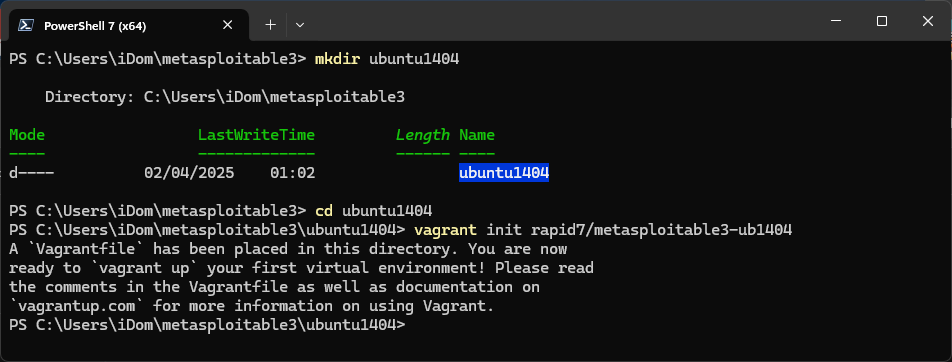 PS C:\Users\iDom\metasploitable3\ubuntu1404> vagrant init rapid7/metasploitable3-ub1404