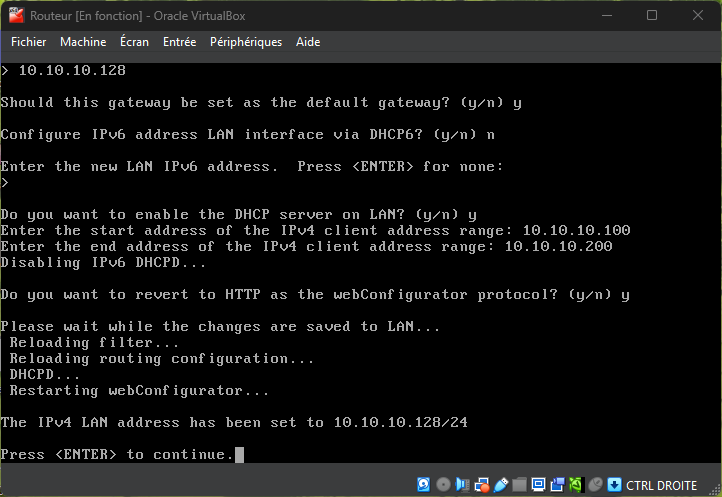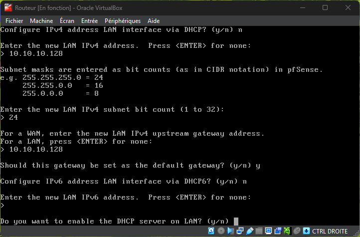 Nous dĂ©sactivons IPv6 (n) puis activons le serveur DHCP sur le LAN (y) avec une plage dâadresses allant de 10.10.10.100 Ă 10.10.10.200. AprĂšs validation, pfSense applique la configuration et confirme que lâadresse IPv4 du LAN est bien dĂ©finie sur 10.10.10.128/24.